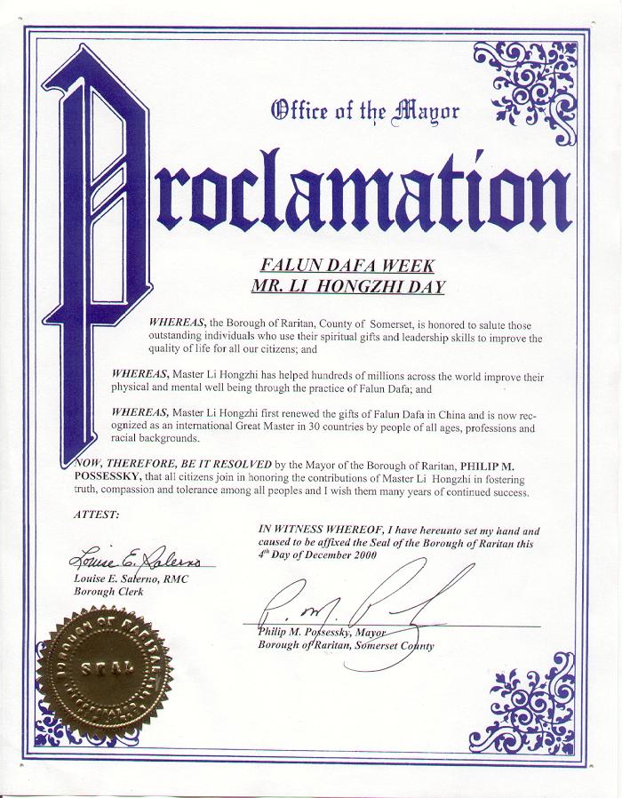 新泽西州弗兰克林市市长宣布2000年12月4-10日为法轮大法周 (Dec/15/2000发表)