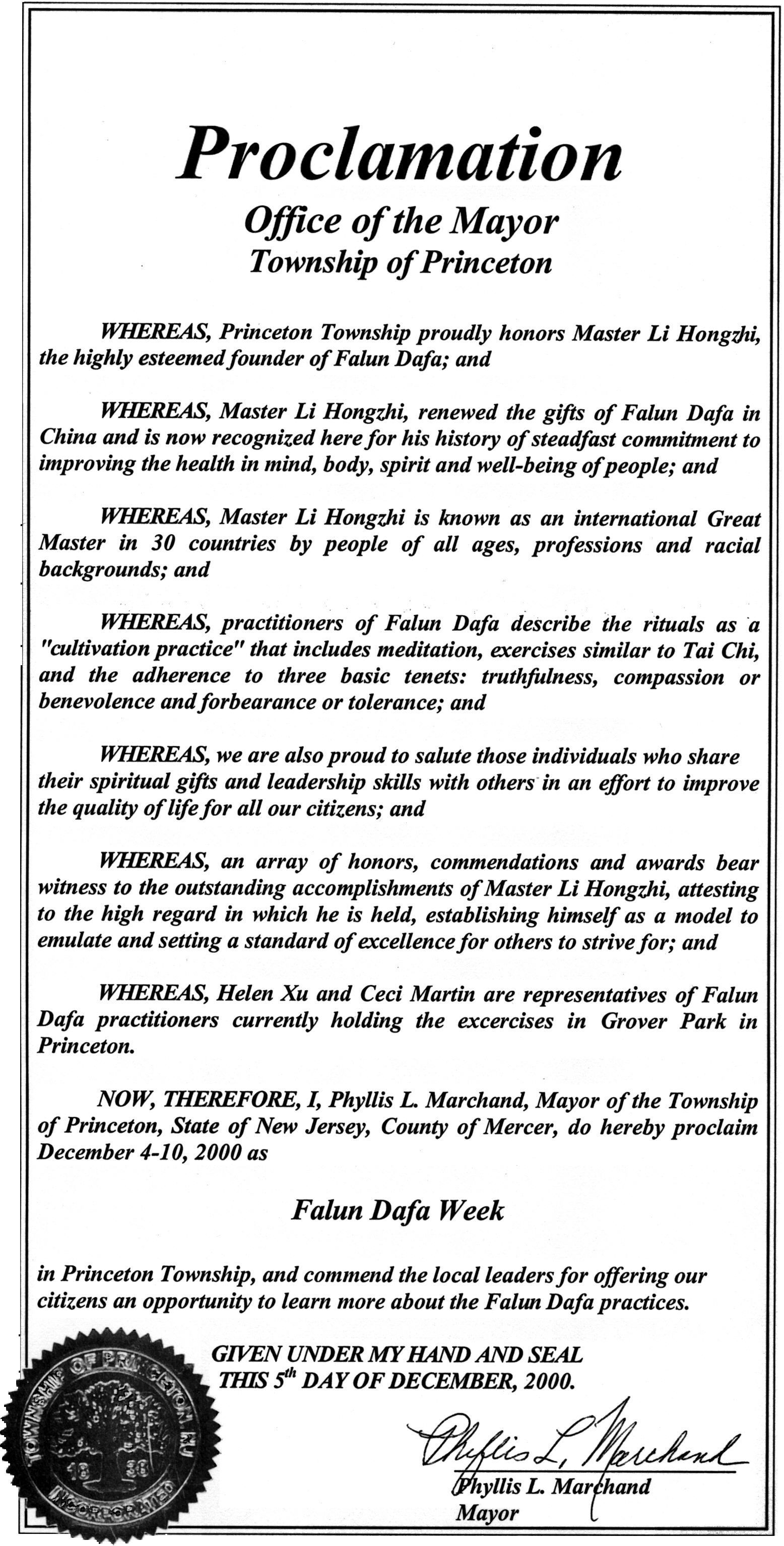 新泽西州普林斯顿市长宣布2000年12月4-10日为该市“法轮大法周” (Dec/12/2000发表)