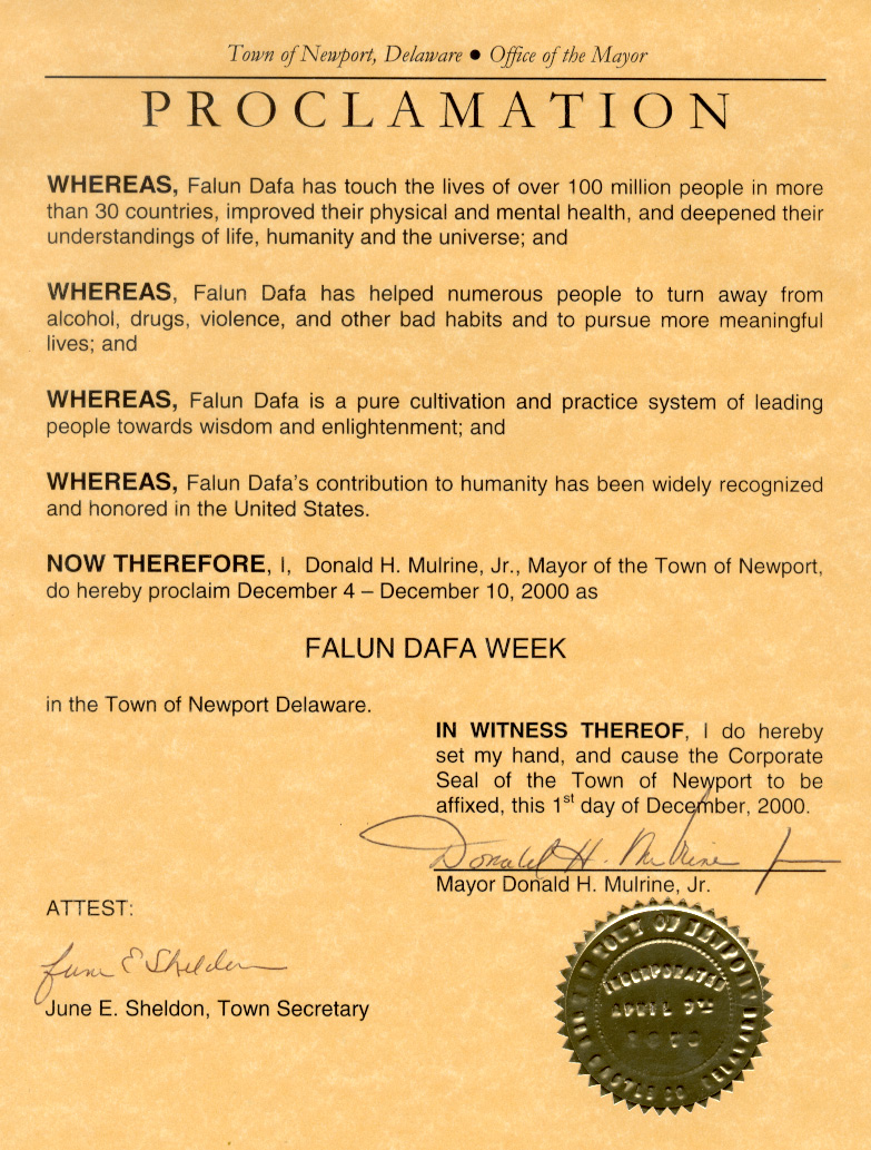 特拉华州新港市“法轮大法周”褒奖令 法轮大法周: 2000年12月4日至10日(Dec/17/2000发表)
