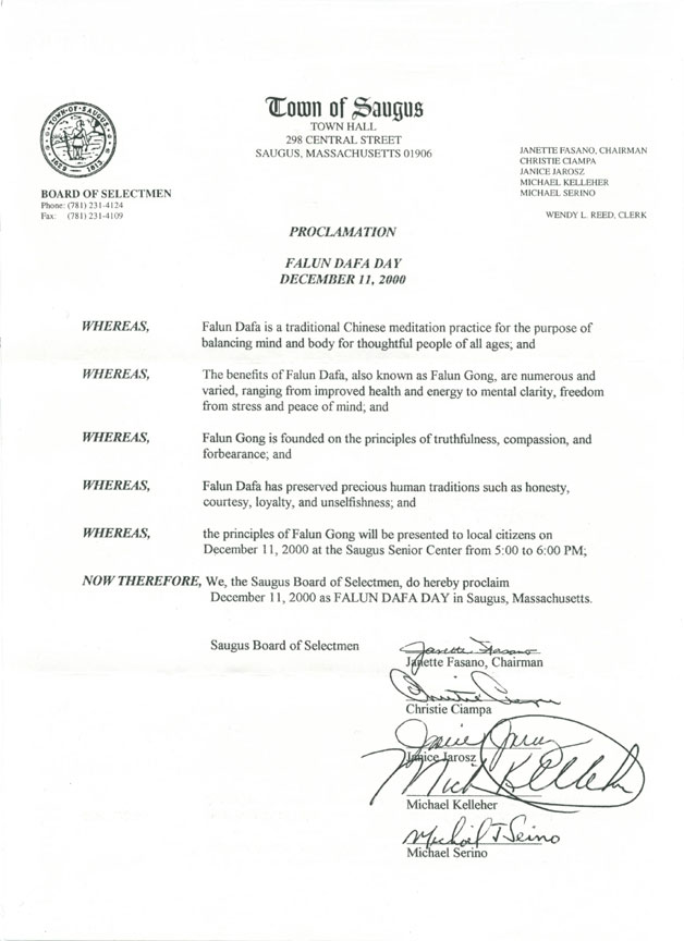 麻萨诸塞州萨古斯镇“法轮大法日” 法轮大法日: 12月11日,2000年(Dec/17/2000发表)